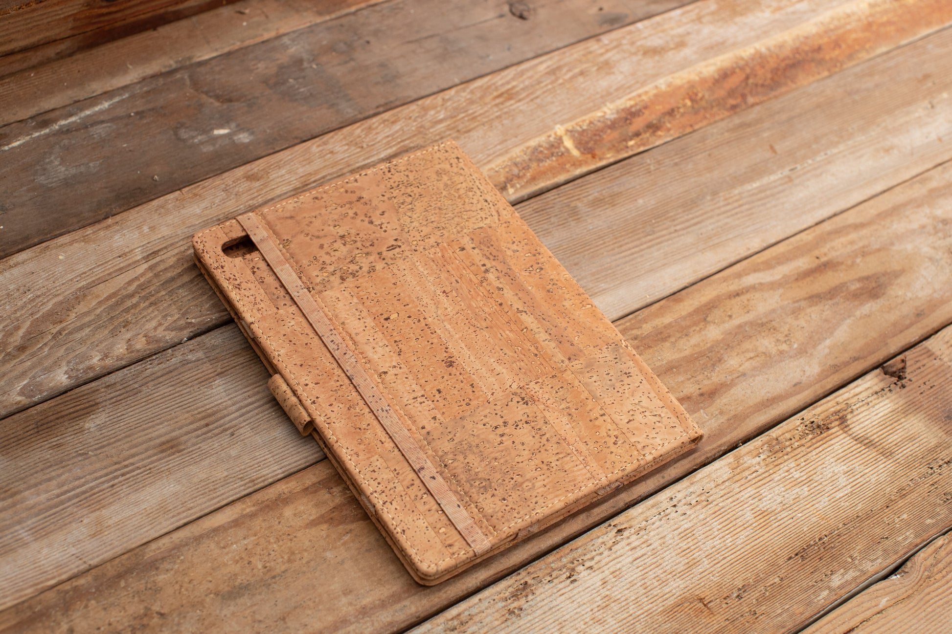 Our cork iPad covers are fashioned from 100% natural cork fabric. These elegantly simple tablet covers feature an elastic band that matches the cork cover color. Designed with an apple pencil holder and camera hole for functionality, the elastic band ensures the iPad remains securely shut while on the move.