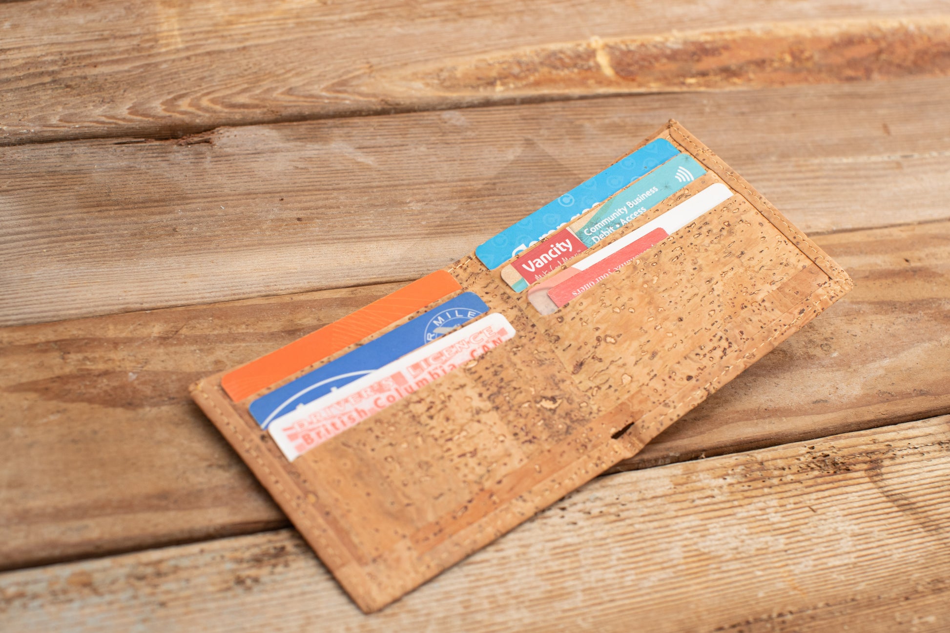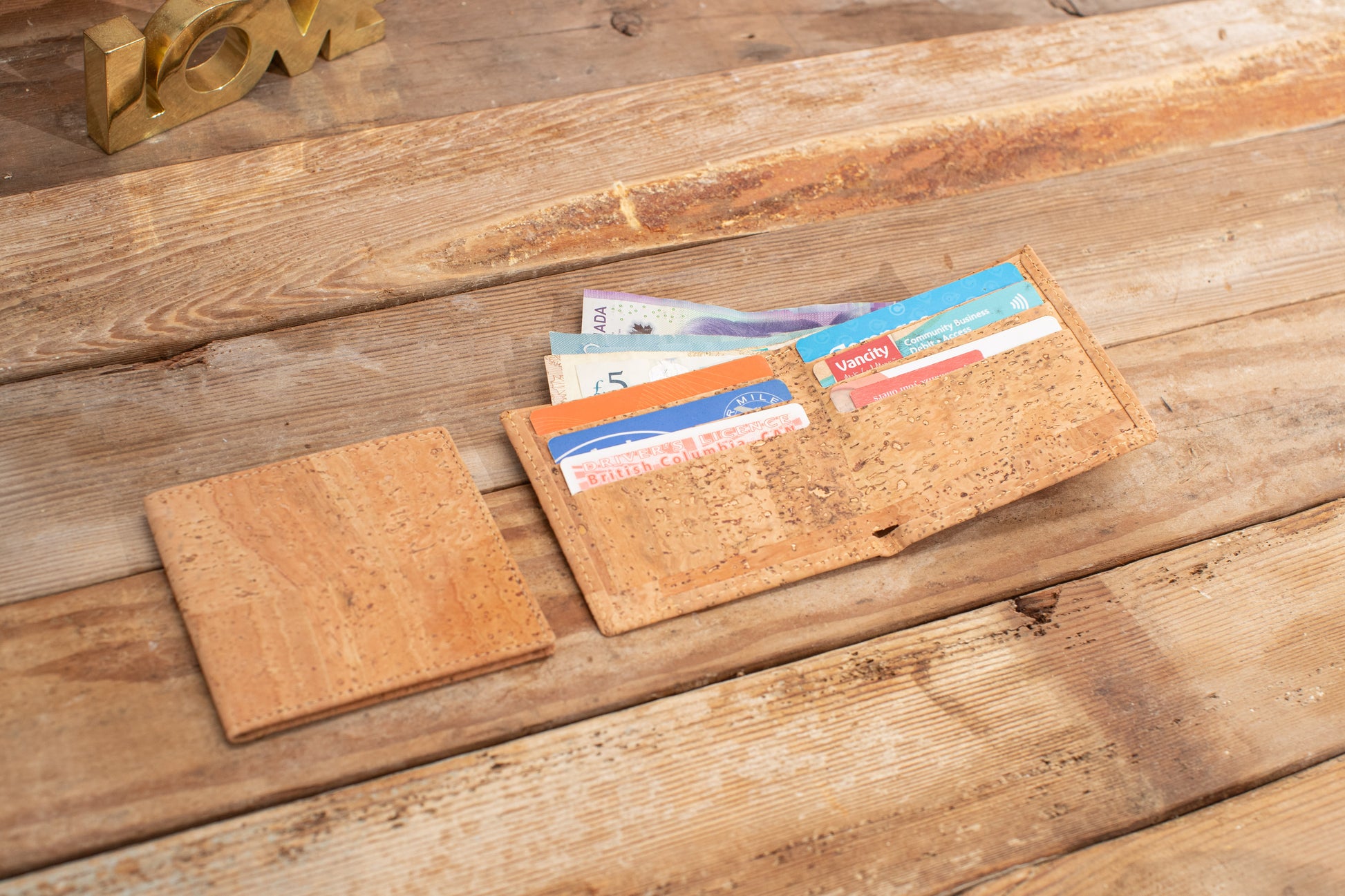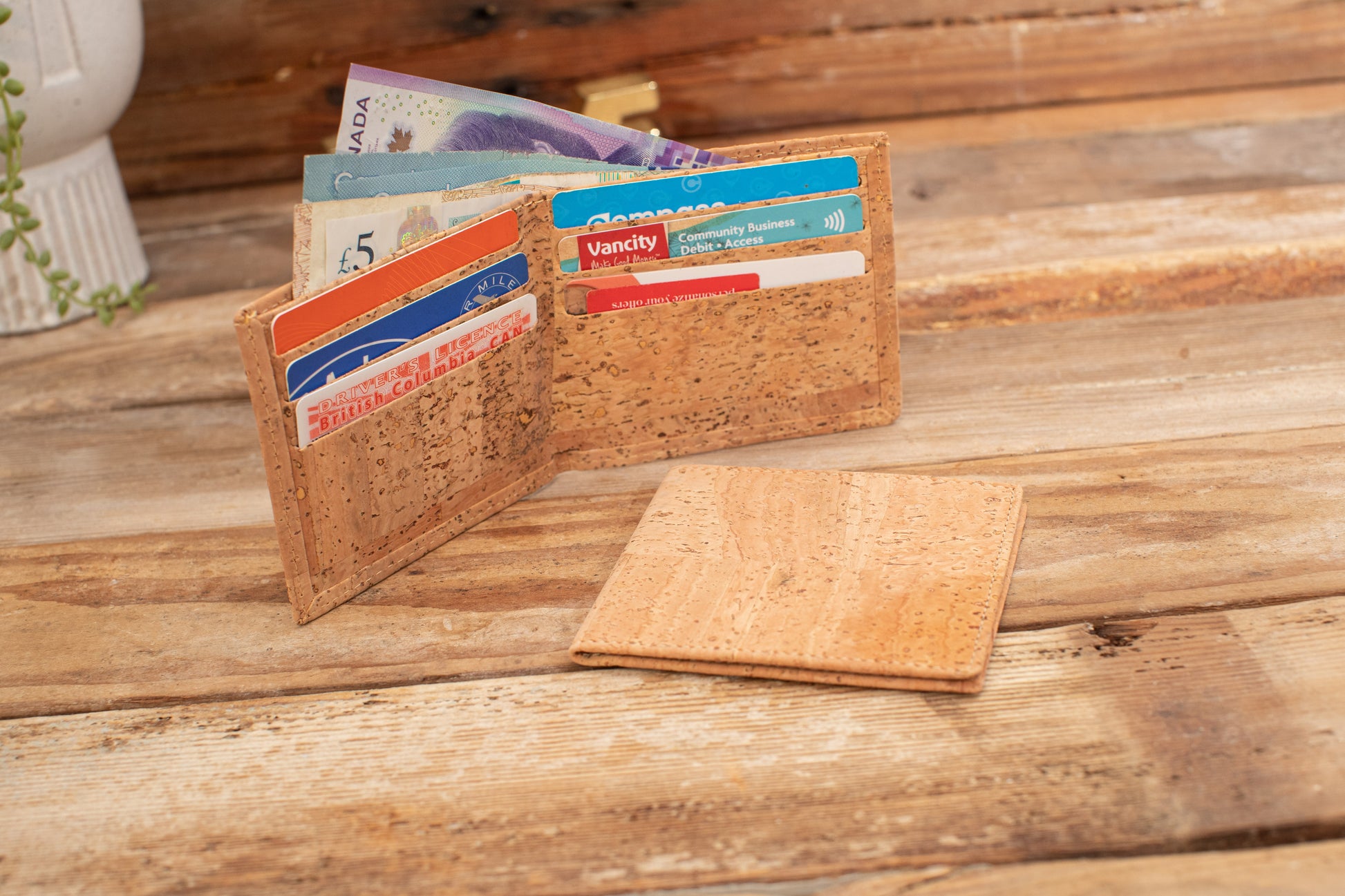 OVERVIEW: This is a 100% natural cork wallet, meticulously handcrafted for men. The cork wallet is particularly slim and includes specific compartments for credit cards and bills.